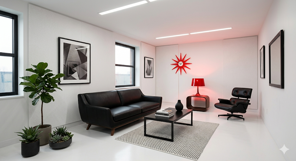전문가들이 미드센추리 모던 인테리어를 할 때 절대 빼놓지 않는 필살기, 바로 시선을 단숨에 훔치는 '강렬한 레드(Red) 포인트'입니다.